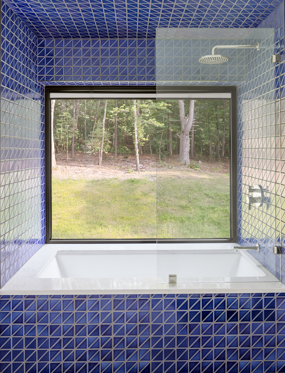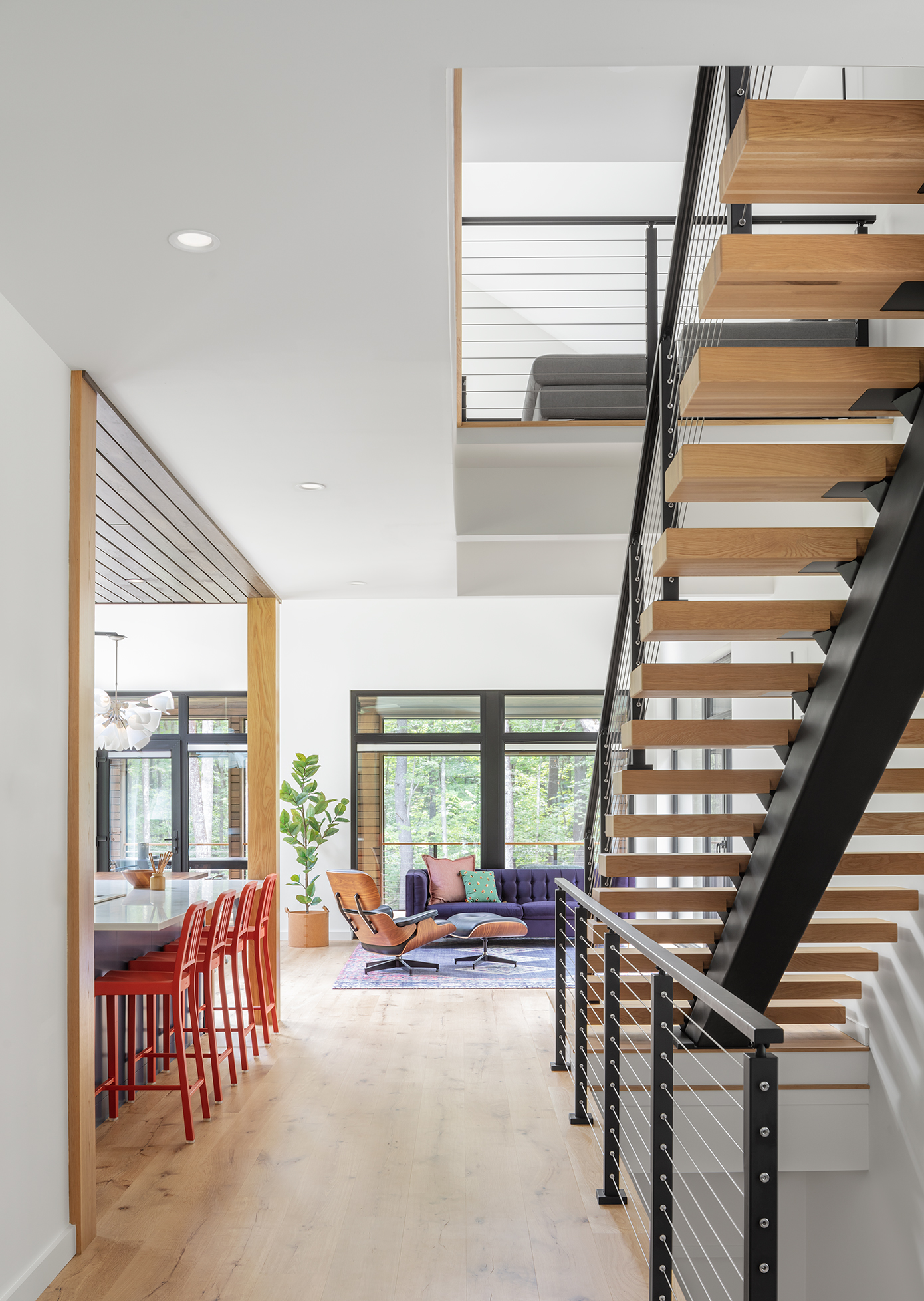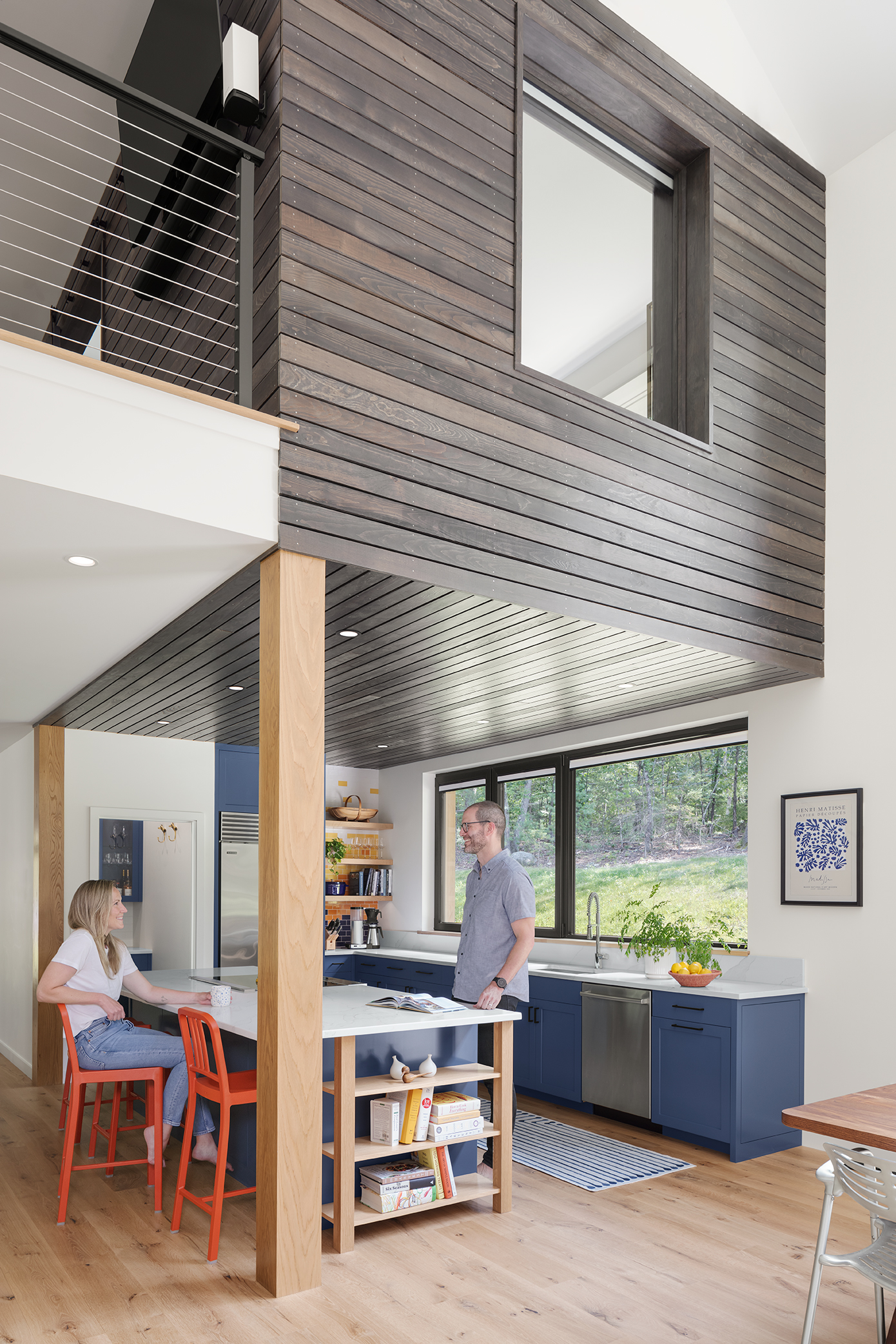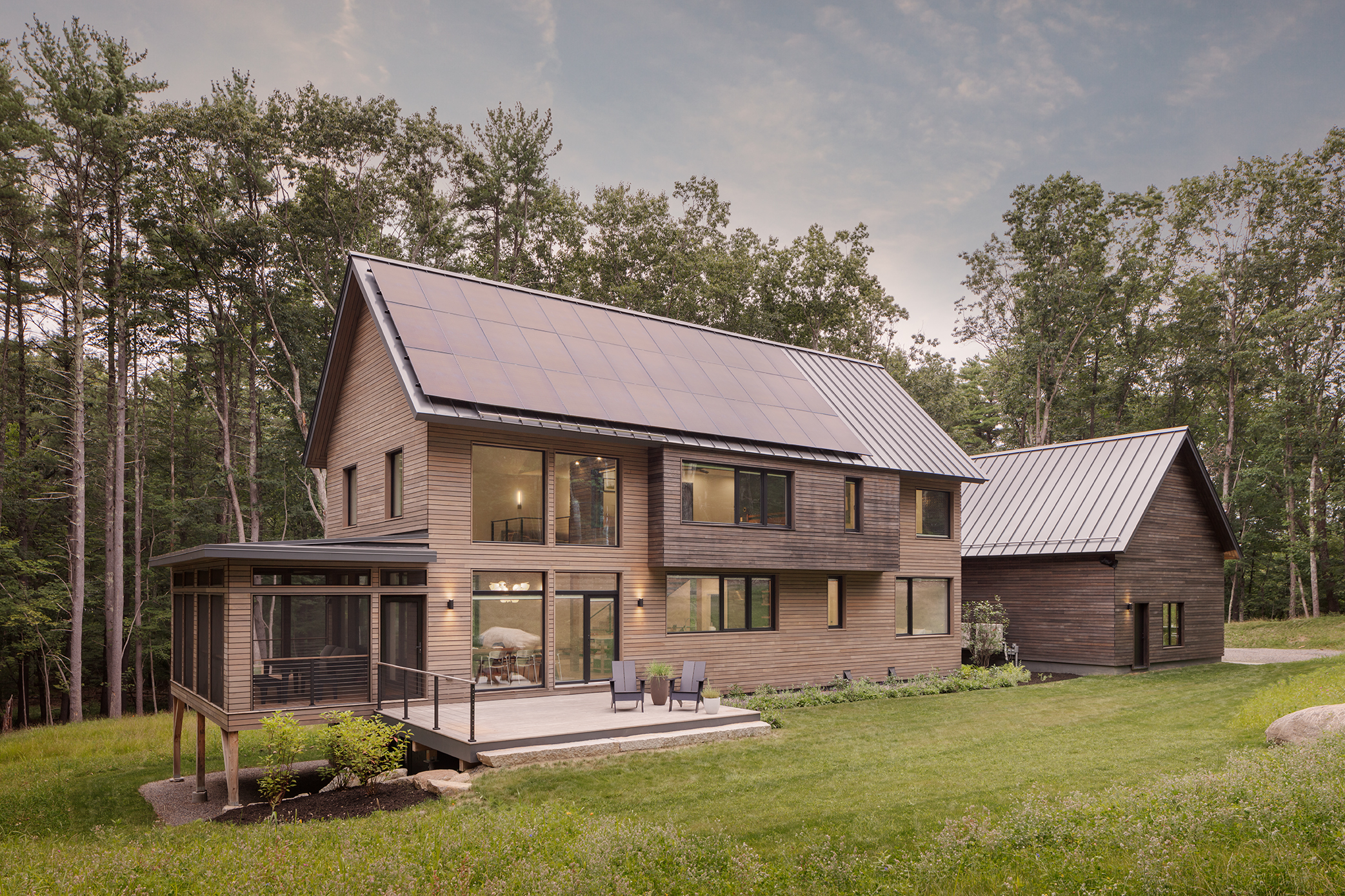 This Durham, NH, home with just under 3,000 square feet of net zero living embraces the efficiency of a classic rectangular form and with careful attention to alignment, proportion and detailing. The gabled volumes are inspired by the traditional architecture of the region, but offer modern spaciousness and flow inside. Oversized, high-performance windows illuminate and provide passive warmth throughout the main space. Rooftop solar generates enough power to cool the all-electric home in summer. Well-insulated walls are clad in square-edge, gapped pine – a Scandinavian nod – that carries into the home’s interior to wrap the primary bedroom suite. A cantilevered loft extension on the second floor jets into the double-height living and dining room. Three bedrooms, three bathrooms and a screened-in porch round out the open floor plan, with workout room and offices below. A detached, barn-like garage connects to the farmhouse porch via a slatted breezeway.