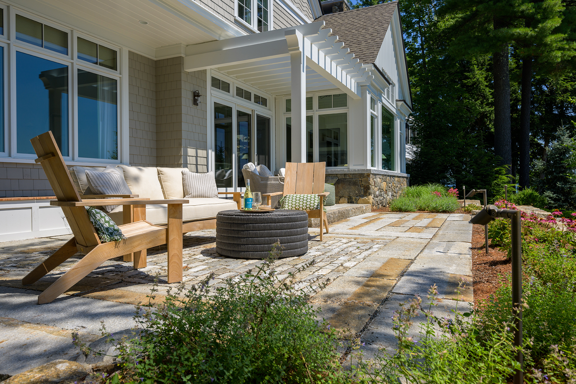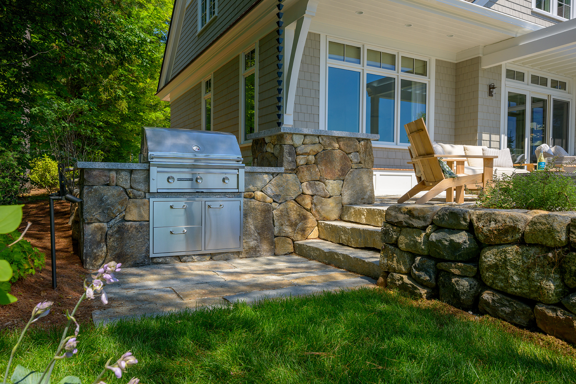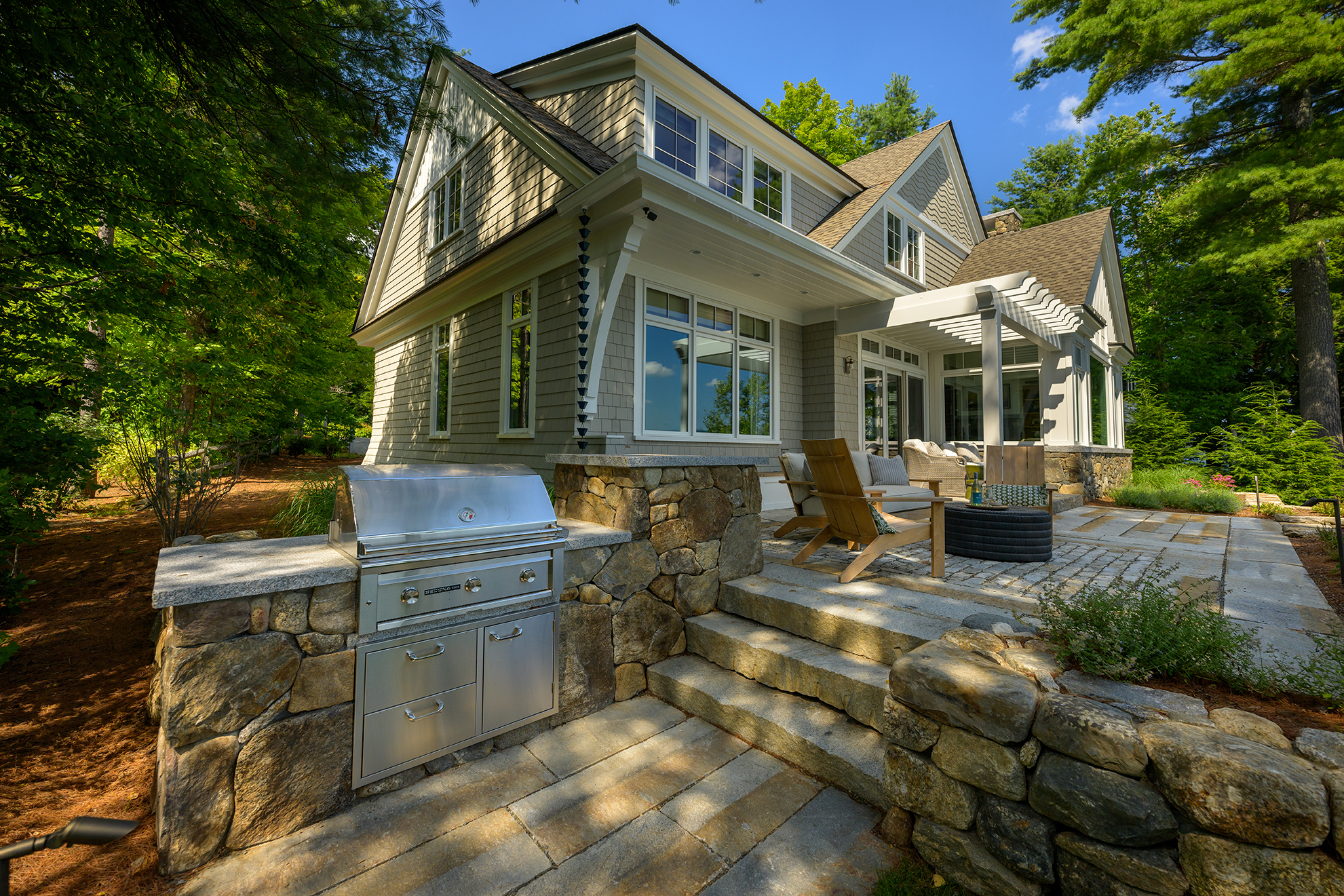 While this Lake Sunapee site’s coverage constraints may restrict the building’s size, shape and hardscape, it provides a unique opportunity for the small yet beautiful details of this project to shine. Timber brackets, a pergola and a built-in bench seat add interest to the outdoor living space. Carefully selected materials include aged granite, natural fieldstone, reclaimed first-generation granite, reclaimed cobblestone and Goshen stone. Low-voltage LED light fixtures provide subtle and delicate lighting around the terrace. Classic perennials like coneflower, catmint and daylilies soak up the sunny southern exposure and soften the hardscape, natural stone walls and veneer. A stainless-steel grill built into the stonework off the terrace is used for outdoor cooking and entertaining. Always cognizant of the environmental impacts of lakefront building, the patio and driveway surfaces were constructed using pervious paving techniques to manage stormwater run-off and protect the lake’s water quality.