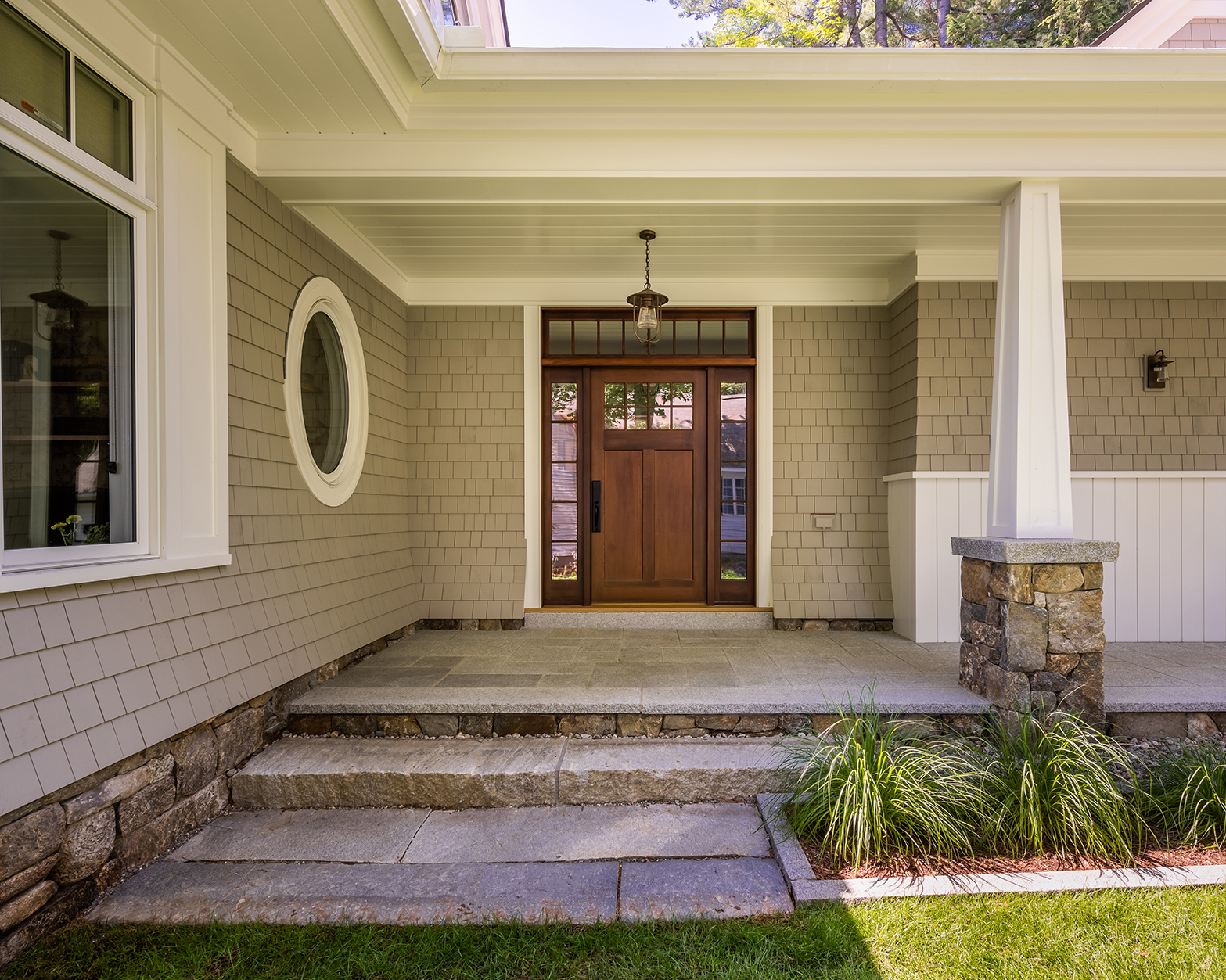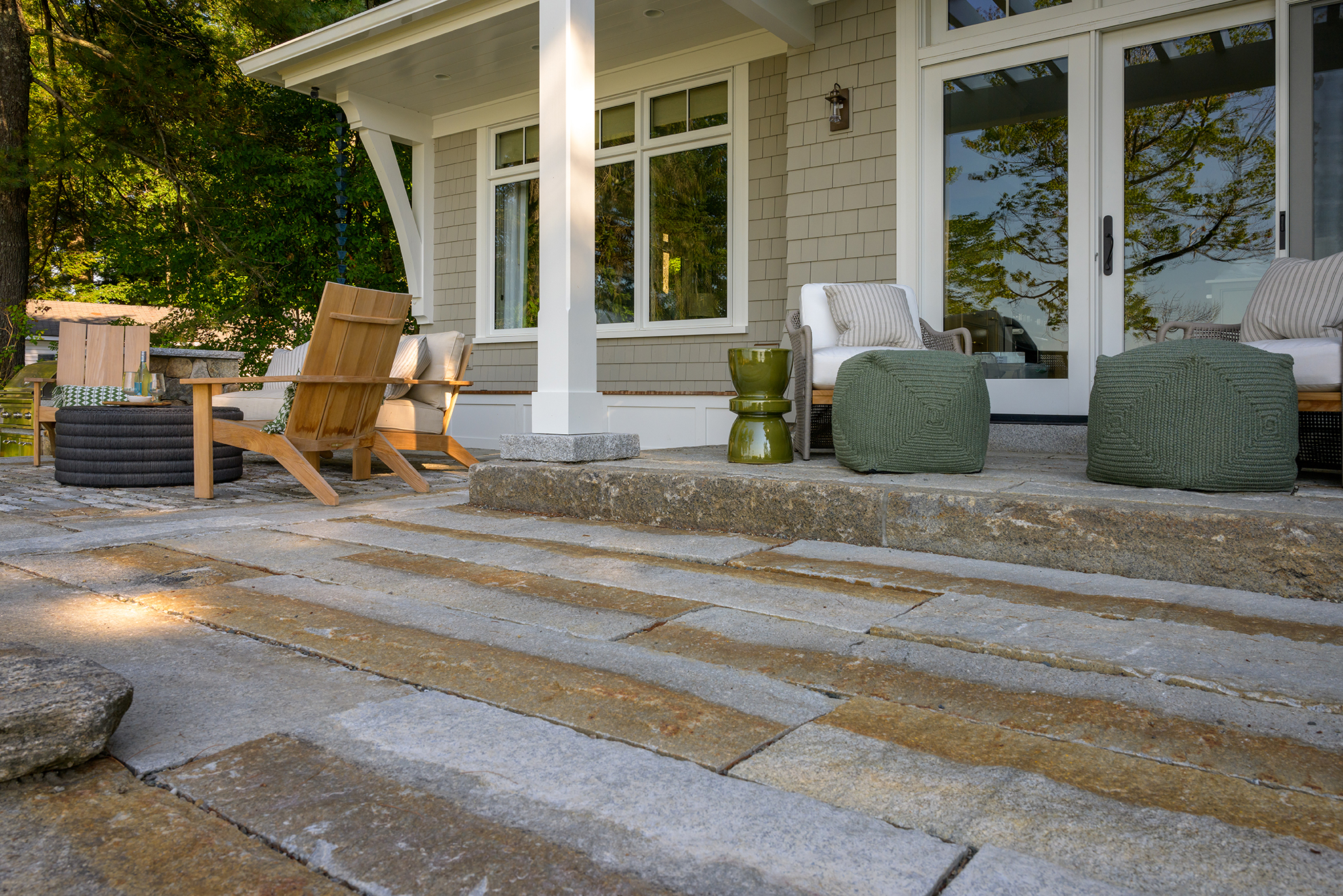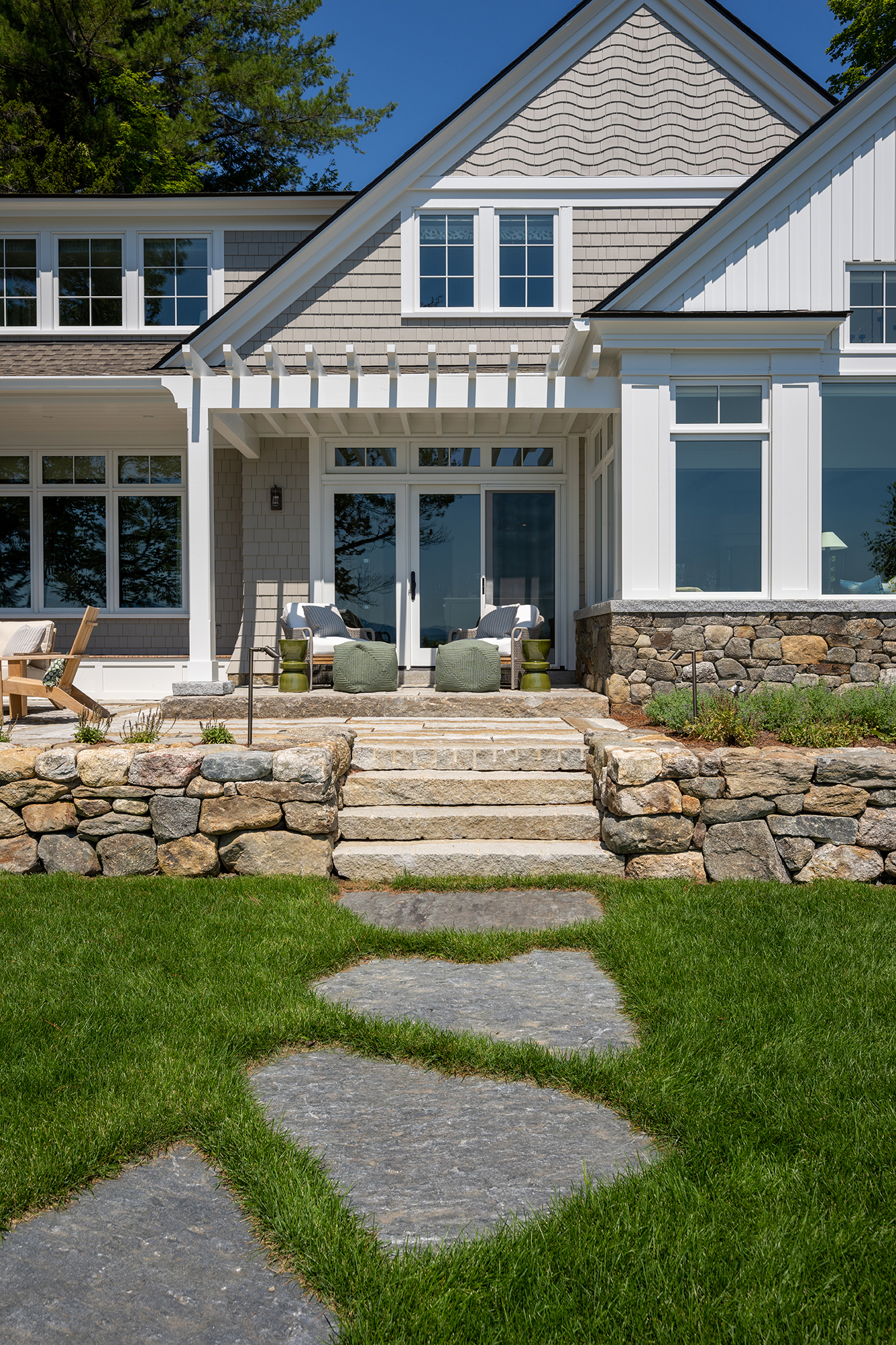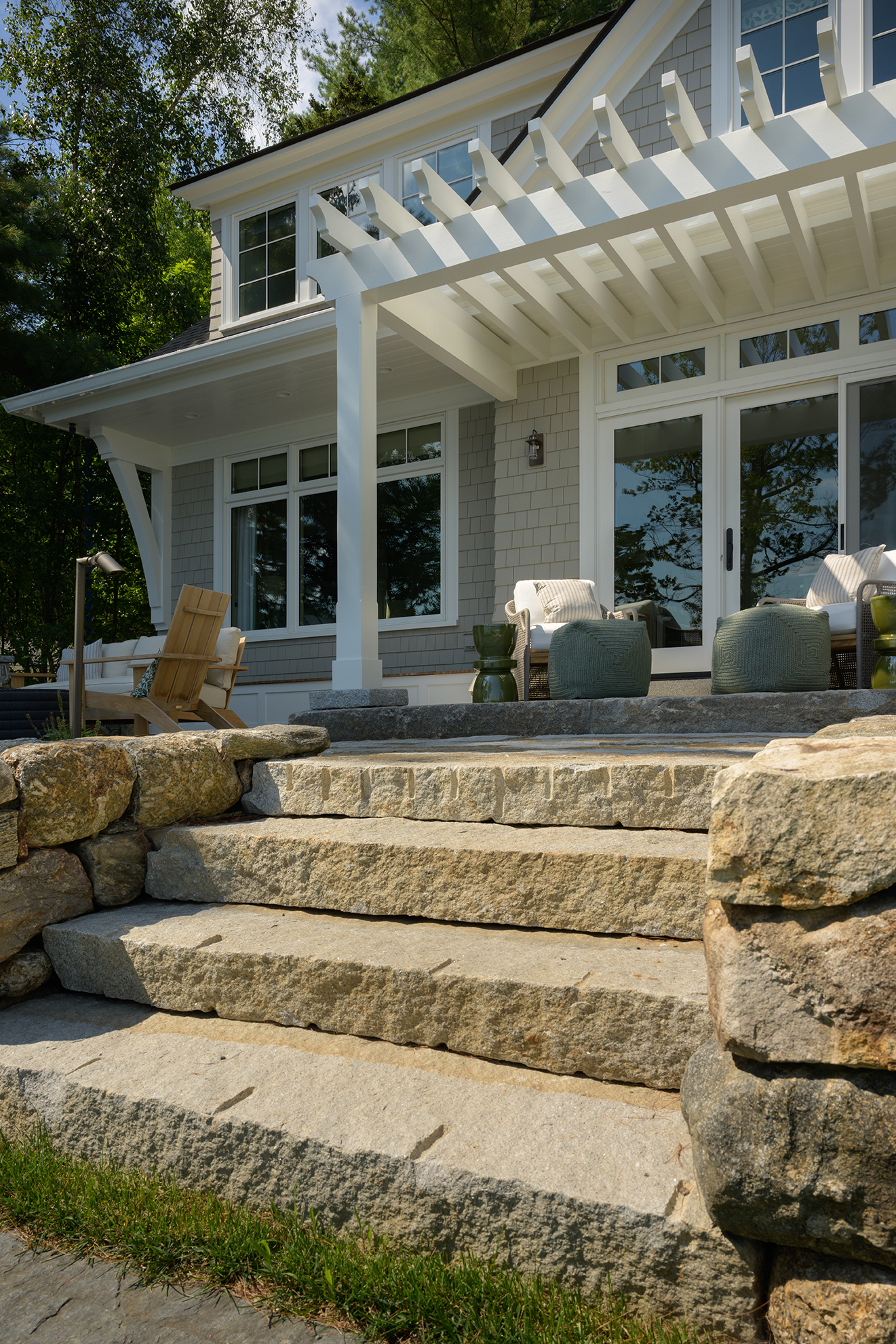 While this Lake Sunapee site’s coverage constraints may restrict the building’s size, shape and hardscape, it provides a unique opportunity for the small yet beautiful details of this project to shine. Timber brackets, a pergola and a built-in bench seat add interest to the outdoor living space. Carefully selected materials include aged granite, natural fieldstone, reclaimed first-generation granite, reclaimed cobblestone and Goshen stone. Low-voltage LED light fixtures provide subtle and delicate lighting around the terrace. Classic perennials like coneflower, catmint and daylilies soak up the sunny southern exposure and soften the hardscape, natural stone walls and veneer. A stainless-steel grill built into the stonework off the terrace is used for outdoor cooking and entertaining. Always cognizant of the environmental impacts of lakefront building, the patio and driveway surfaces were constructed using pervious paving techniques to manage stormwater run-off and protect the lake’s water quality.