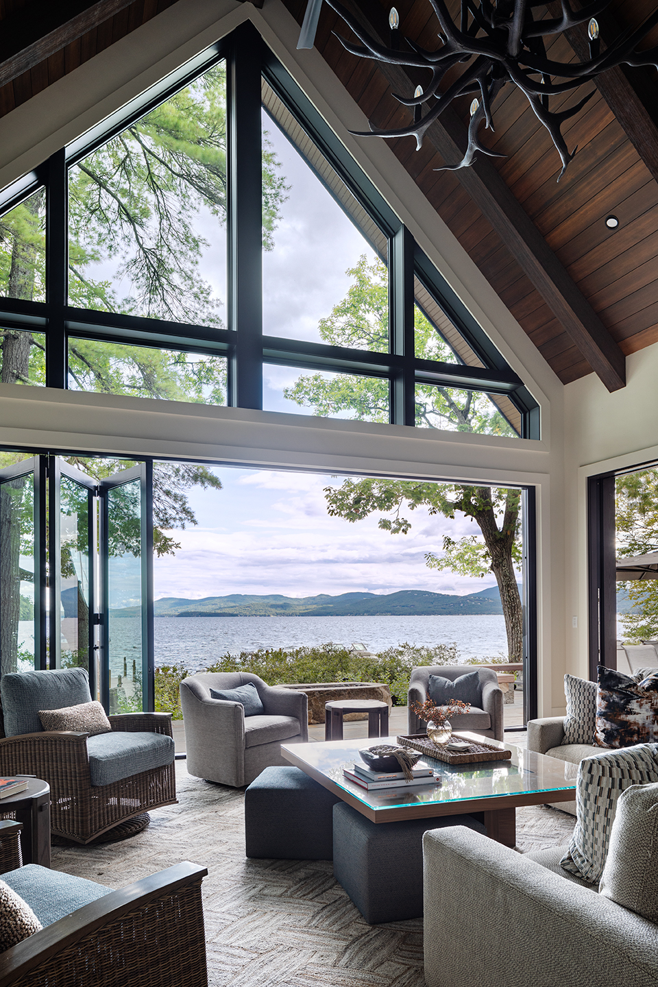 Nestled along the shores of Lake Winnipesaukee, this extraordinary 11,000-square-foot family home is designed to accommodate over 20 family members, who can relax in the sauna or hot tub, or hang out in the game room or four-season sunroom. Surrounded by lush greenery, the client sought seamless integration with the landscape, leading to the exterior featuring a dark cladding that harmonizes with the surroundings and expansive openings that mirror the natural beauty of the area. Large windows and doors allow natural light to flood the space. By mixing various metal and wood materials, a light, bright space was achieved that embraces both the contemporary and the rustic. Lindsay Lawrence specified all materials and furnishings and fully integrated with the builder, architect and landscape architect to ensure everything feels cohesive from one space to the next, inside and out. Now, this timeless home looks like a natural part of its surroundings and is primed for many generations and memories to come!