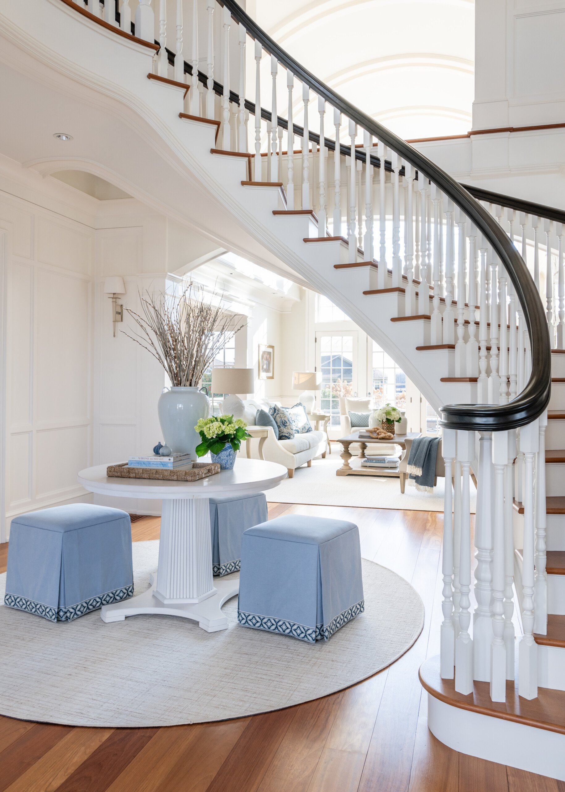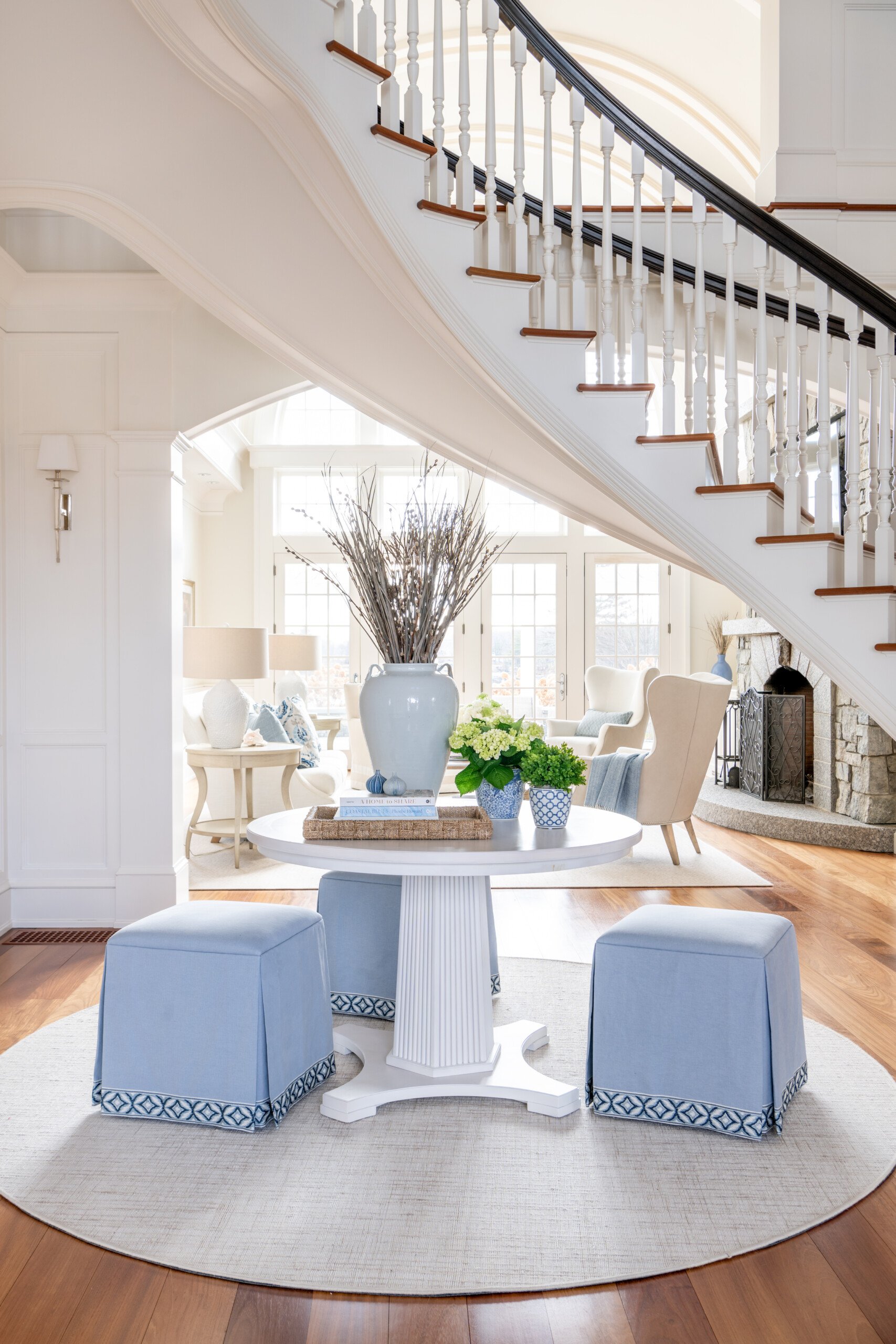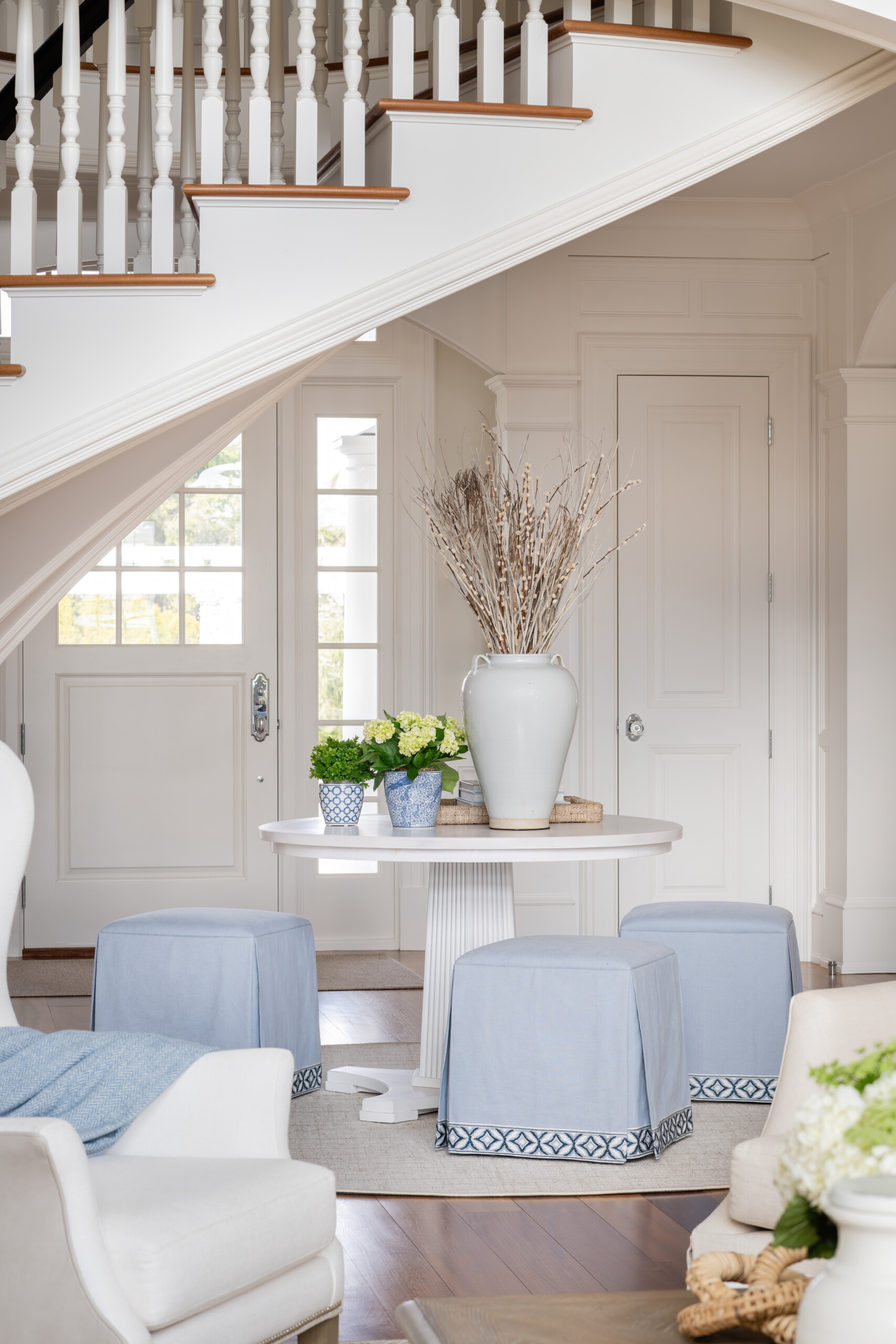 The stunning architectural details of this home’s entrance called for a classic design. Following the lines of the curved staircase, a large, round pedestal table was placed in the center atop a custom silk and wool round rug in neutral tones. Cubed custom ottomans in a soft blue with tape detailing provide a place to sit when removing one’s shoes and also serve as additional seating in the adjacent great room. Herringbone cushions with contrast white welt were added to the window seats along the twin hallways. Runners in the same pattern as the round rug were added to ground the space. The floral-and-plaid-patterned pillows with fun, fringe detailing add a much-needed pop of color and coordinate with the ottomans. It’s the perfect spot for guests to sit when entertaining or for curling up with a good book. Lastly, marsh grasses, fresh greens and a woven tray atop the pedestal table were added to reflect the home’s coastal location.