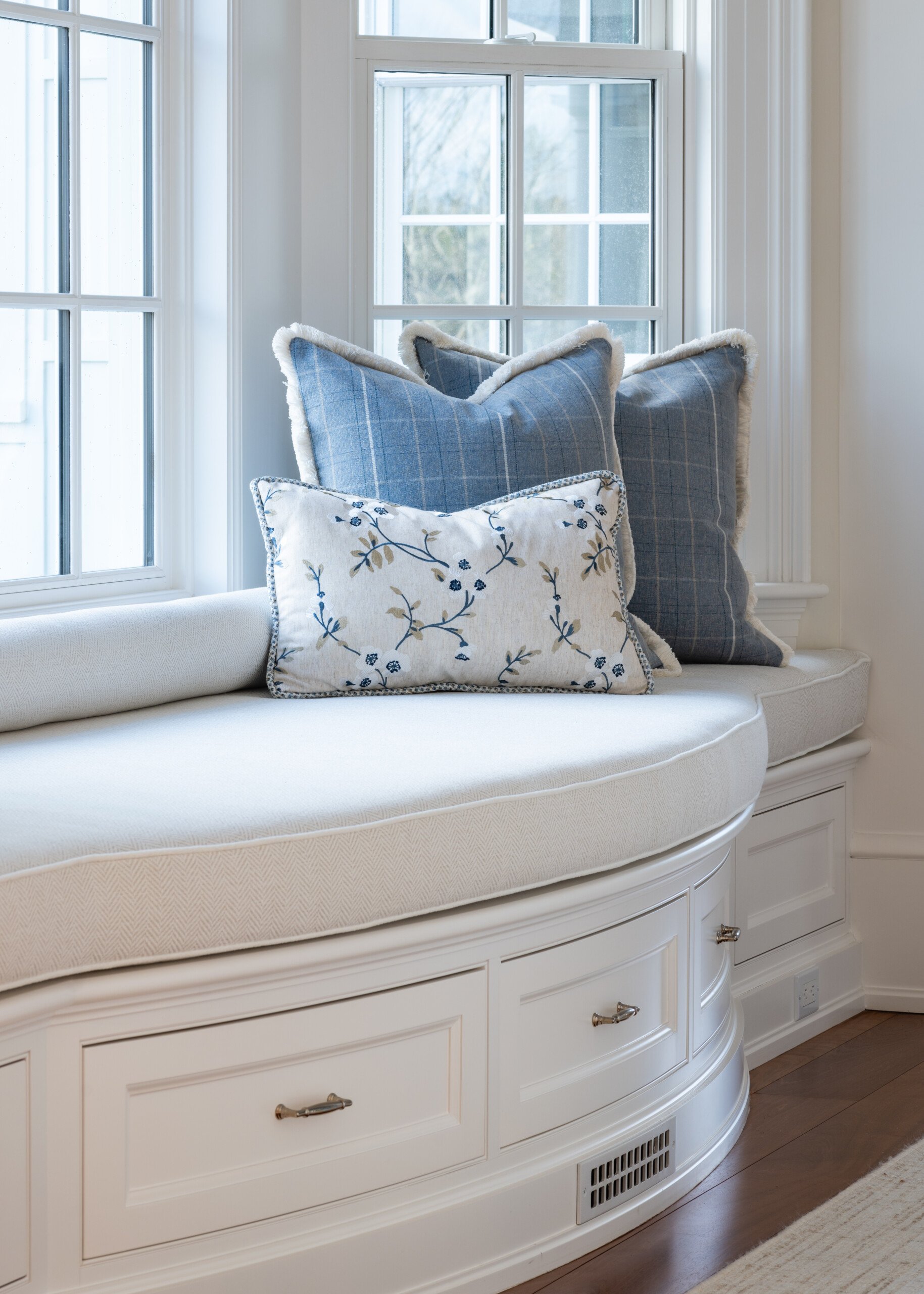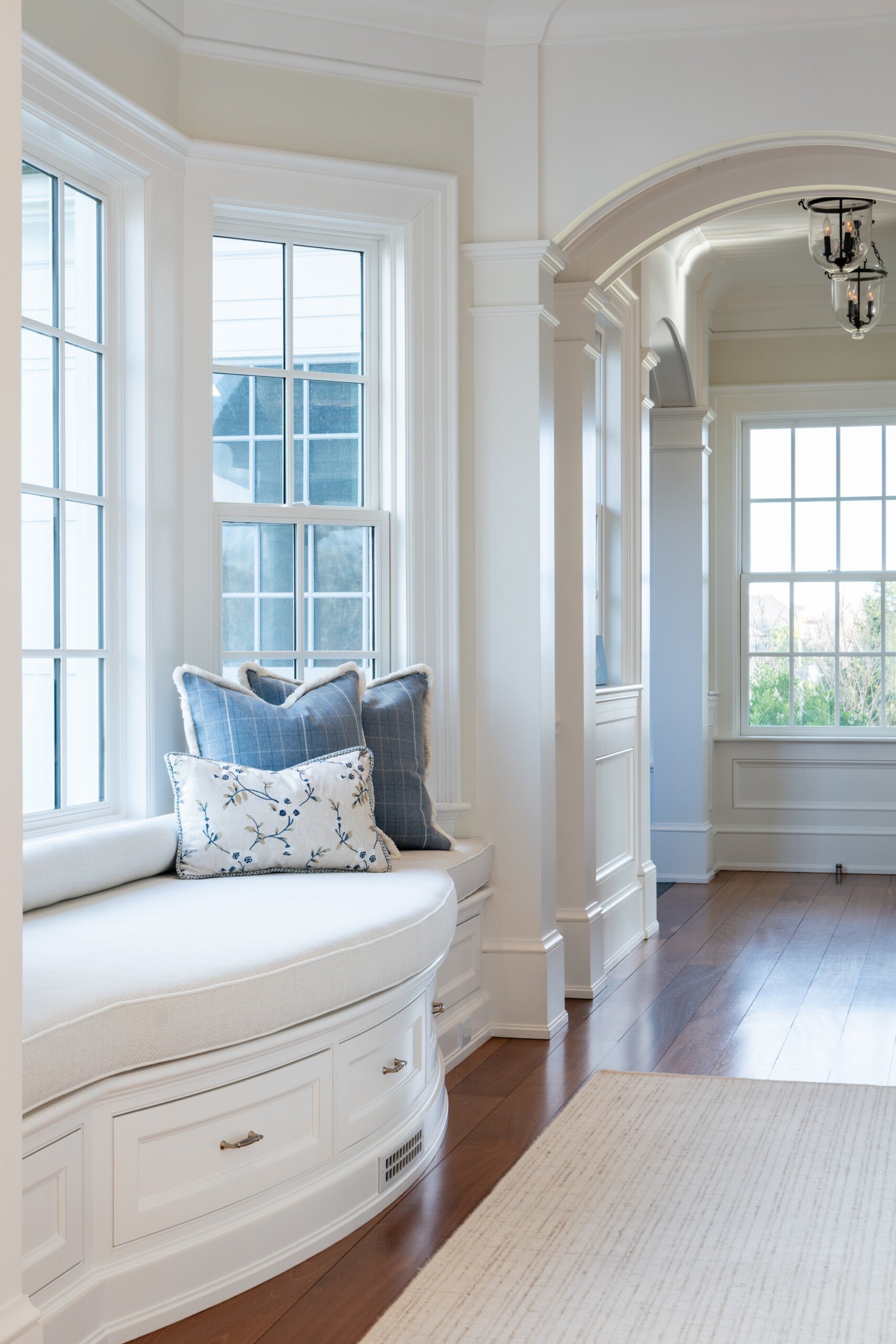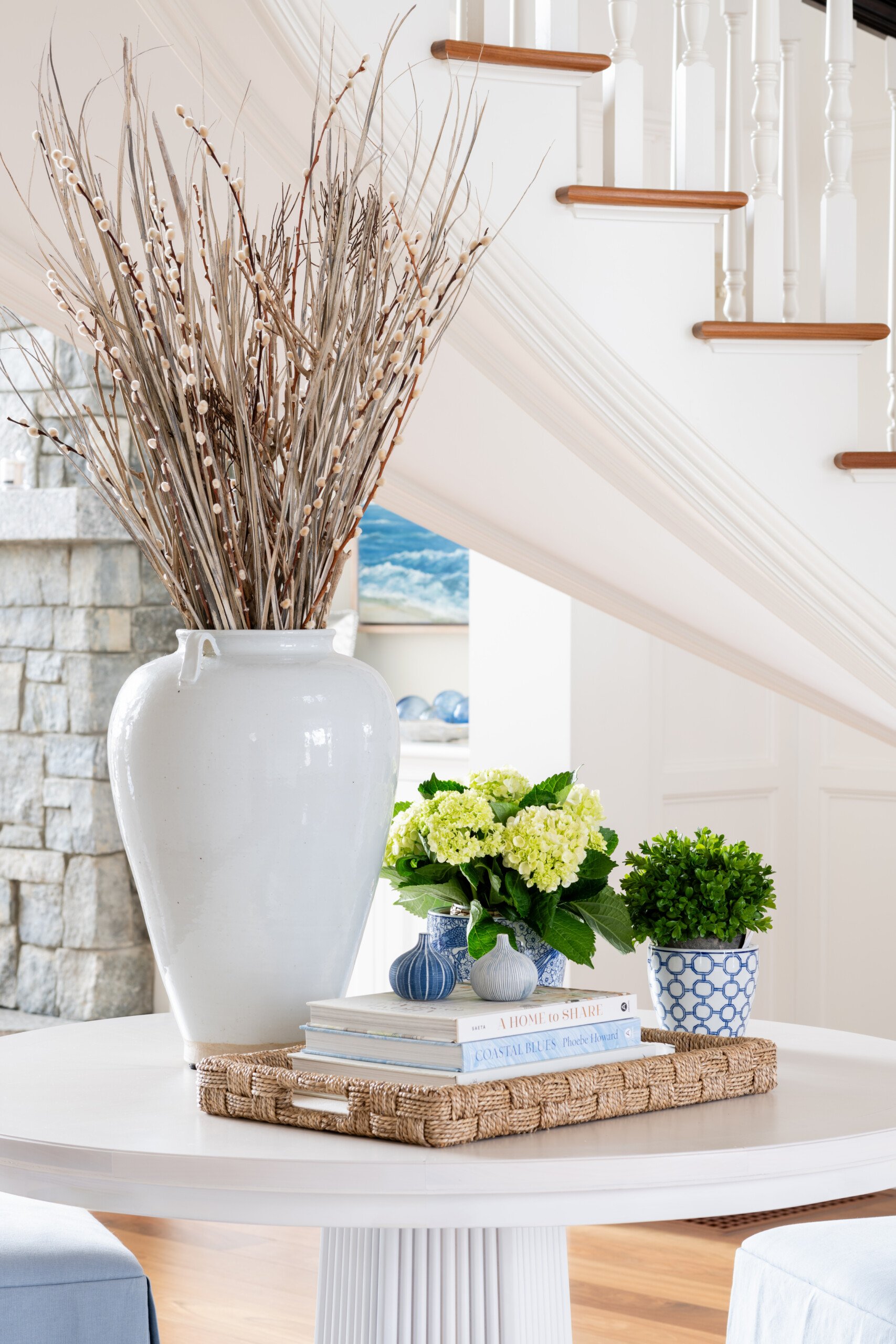 The stunning architectural details of this home’s entrance called for a classic design. Following the lines of the curved staircase, a large, round pedestal table was placed in the center atop a custom silk and wool round rug in neutral tones. Cubed custom ottomans in a soft blue with tape detailing provide a place to sit when removing one’s shoes and also serve as additional seating in the adjacent great room. Herringbone cushions with contrast white welt were added to the window seats along the twin hallways. Runners in the same pattern as the round rug were added to ground the space. The floral-and-plaid-patterned pillows with fun, fringe detailing add a much-needed pop of color and coordinate with the ottomans. It’s the perfect spot for guests to sit when entertaining or for curling up with a good book. Lastly, marsh grasses, fresh greens and a woven tray atop the pedestal table were added to reflect the home’s coastal location.