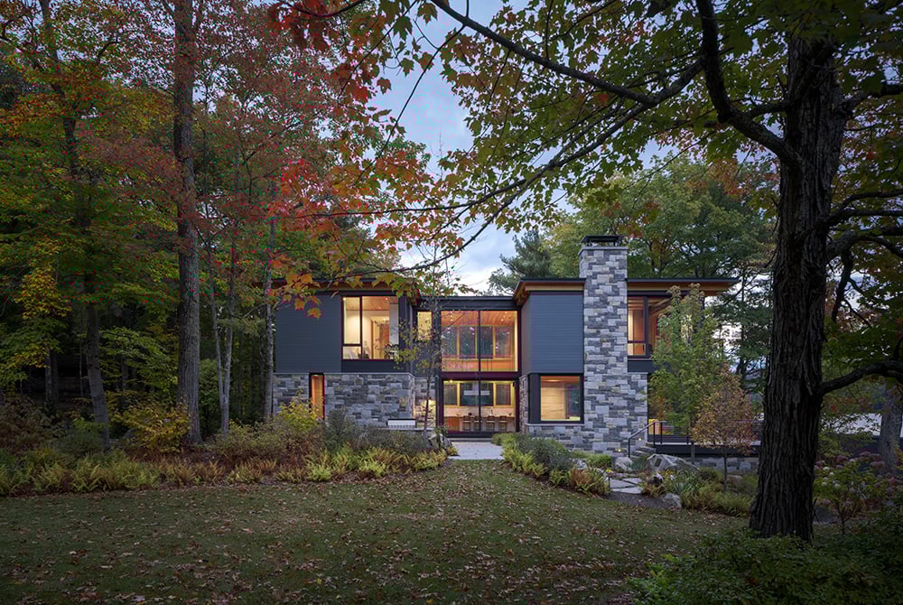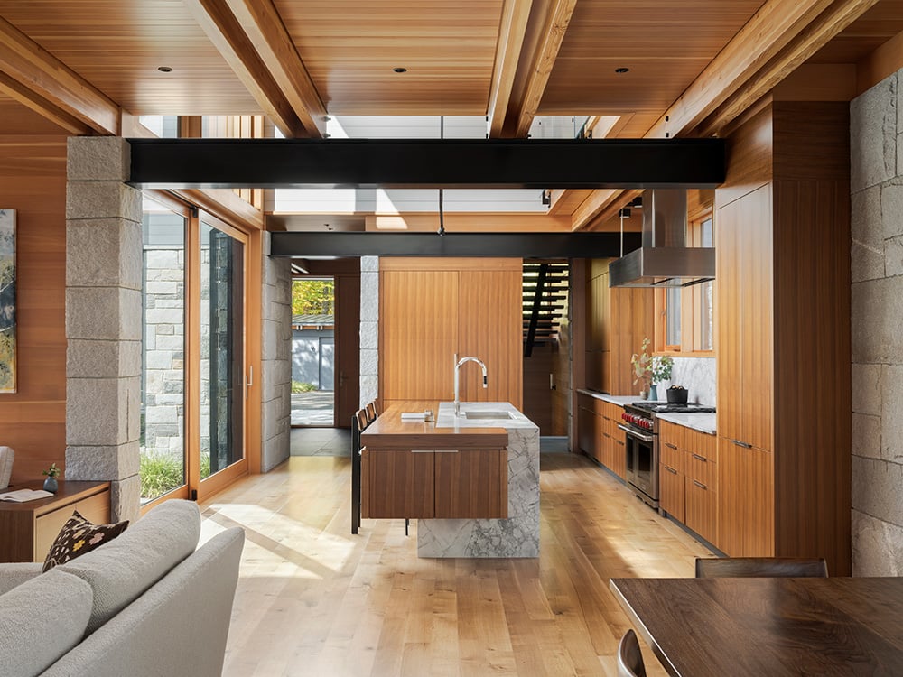 This modern residence transforms a constrained waterfront site into a cohesive family compound that harmonizes architecture, landscape and legacy. The design establishes a strong dialogue between a new residence and an existing cottage, connected through a carefully positioned courtyard that guides circulation and frames entry into the home’s central kitchen. Inspired by the craftsmanship of classic wooden boats, the material palette — local granite, Douglas fir, and precision metalwork — reflects both durability and refinement. The entry sequence unfolds dramatically, moving through a granite-lined passage into a luminous living space framed by expansive glazing. A two-story steel moment frame enables sweeping lake views while maintaining structural clarity. Light is carefully orchestrated throughout, from skylit bathrooms to a sculptural staircase that distributes daylight across levels. Crafted with input from local artisans, the home balances technical precision with tactile richness, creating a modern lakeside retreat that is both sophisticated and deeply connected to its surroundings.