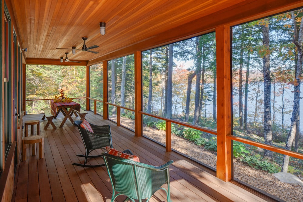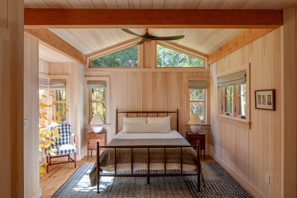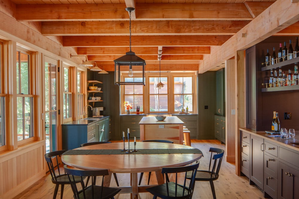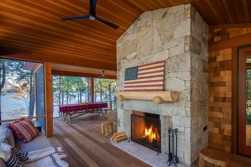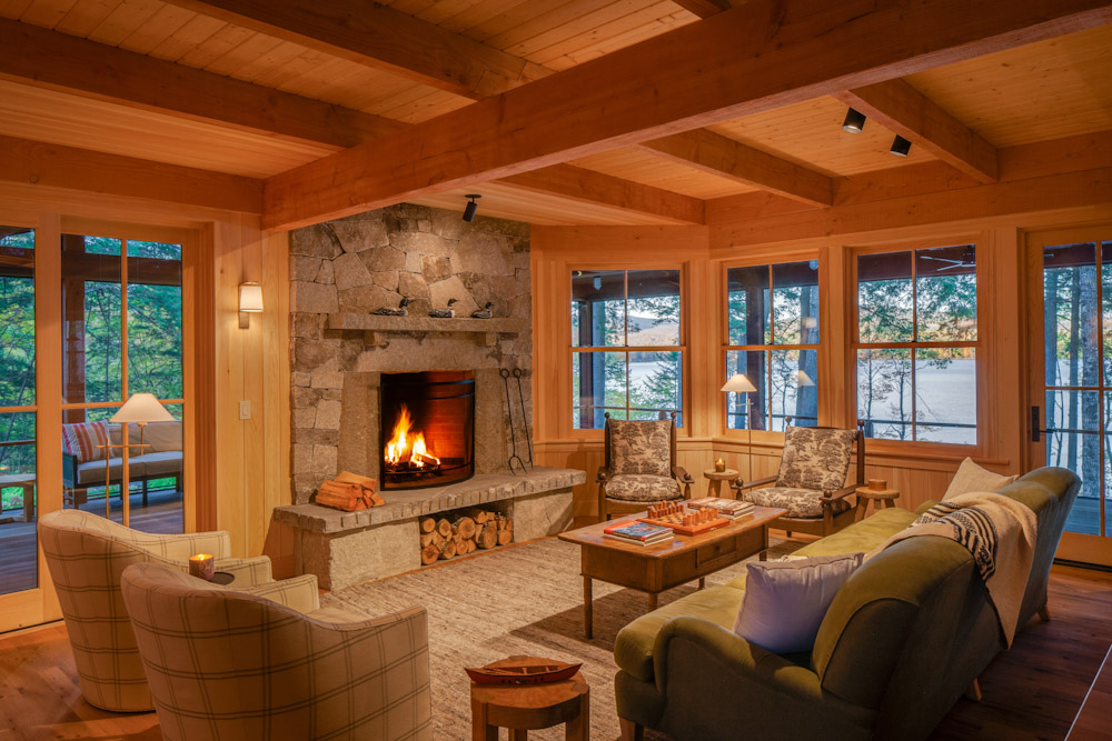Designed as a traditional Maine camp for multigenerational gatherings, this lakeside retreat has remained in the family since 1898. The upland facade is anchored by a stair tower that serves as a welcoming beacon for arriving guests while providing natural ventilation and a playful lookout for children. On the lake side, a generous wraparound porch with dormers above pays homage to the original camp that once stood on the site. Inside, fine craftsmanship defines the interiors, from exposed post-and-beam construction to extensive wainscoting and reclaimed oak floors. The result is a timeless camp that balances heritage and comfort while embracing its long-standing connection to place.