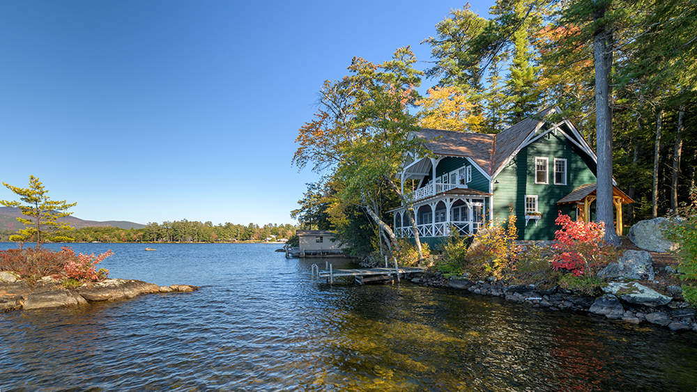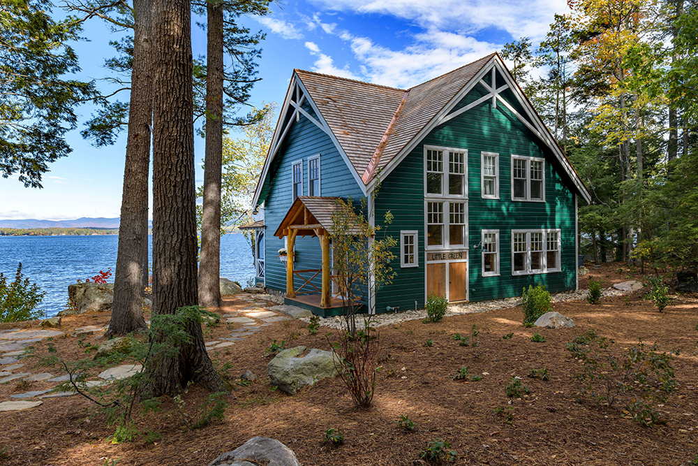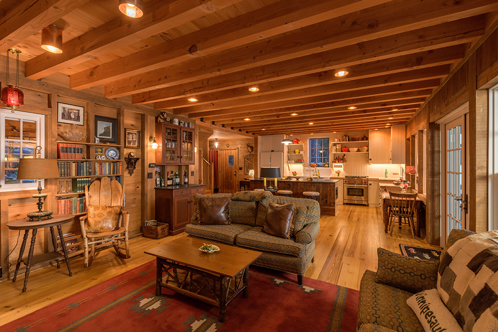 This lakeside project reimagines a circa-1920 fishing camp, expanding its footprint while preserving its historic character. Constrained by setback regulations, the structure could not be demolished, prompting a thoughtful renovation. The building was lifted, retaining the original floor system and two exterior walls, while a second level and stacked porches were added to increase livable space. To minimize shoreline impact, cantilevered concrete beams support the lakeside porches without disturbing existing trees. Inside, exposed framing and traditional paneling maintain the camp’s rustic authenticity, complemented by refinished sinks and rewired vintage light fixtures. Salvaged materials, including original loft flooring, were reused, adding depth and continuity. Despite its historic expression, the home performs to modern standards, with continuous exterior insulation, a tightly sealed roof, and an insulated crawlspace.