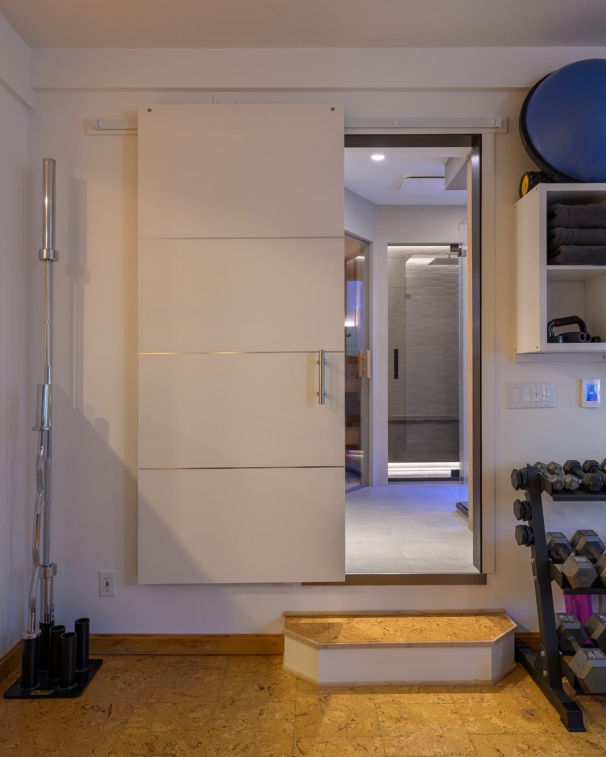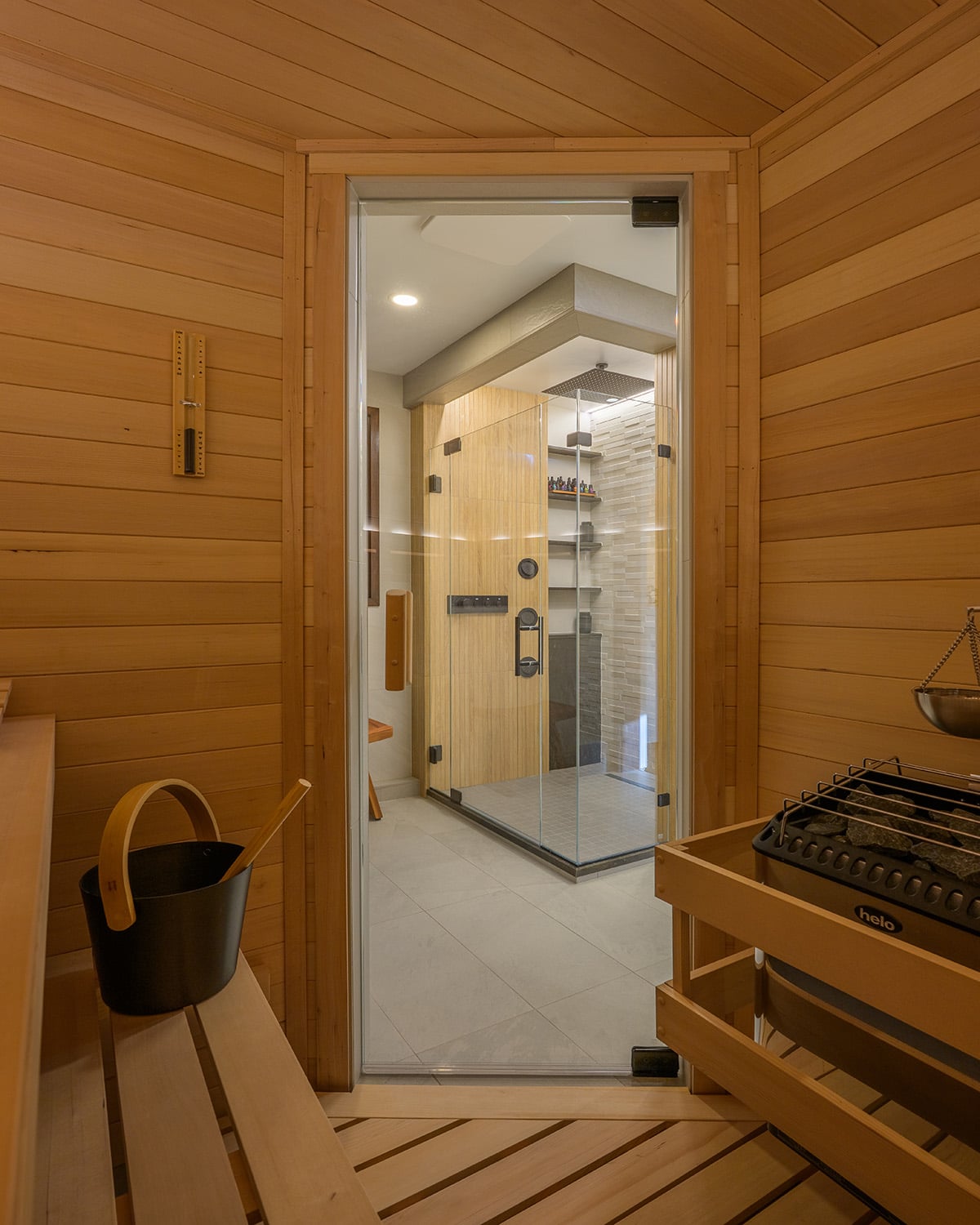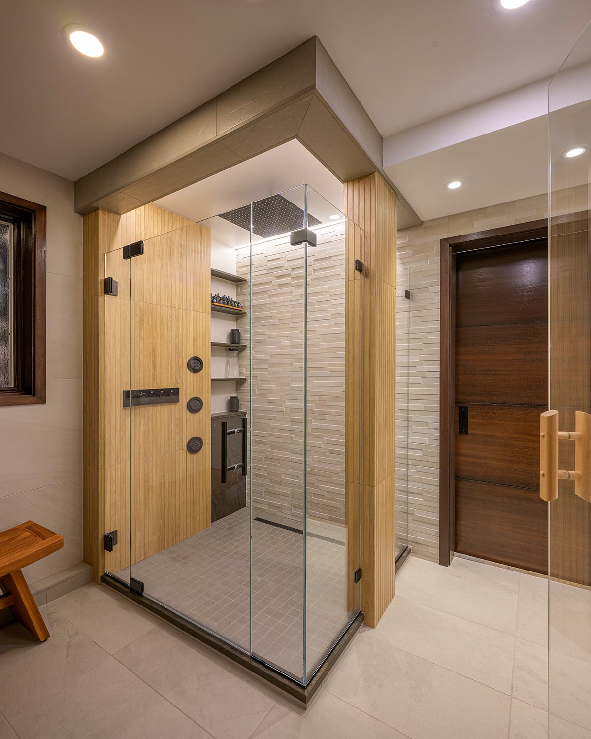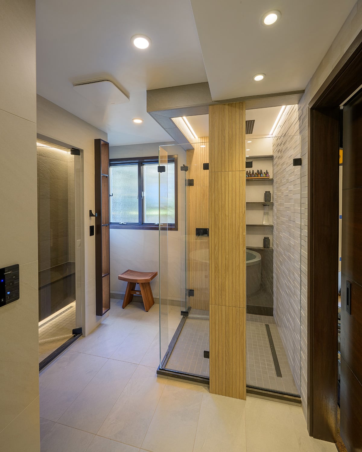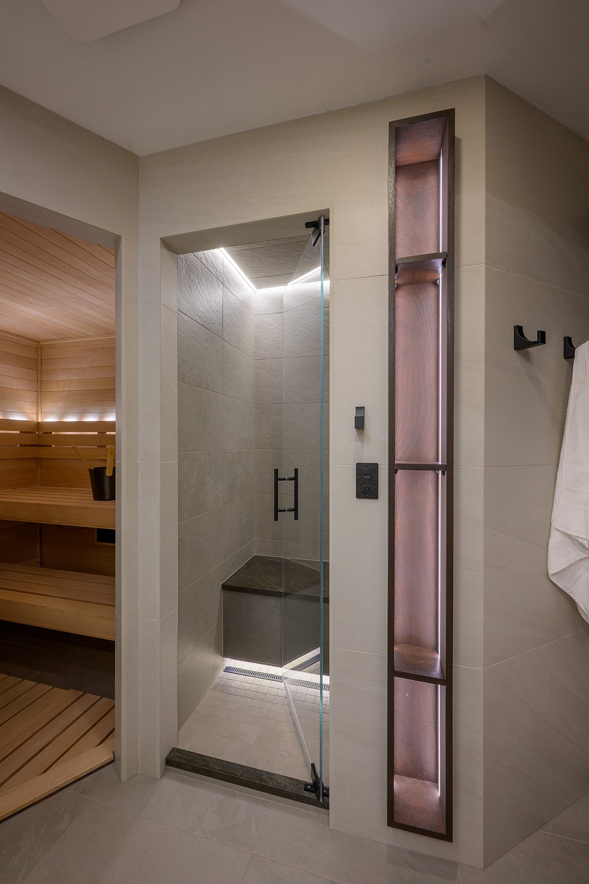 Designed to support a disciplined wellness routine, this custom spa suite integrates multiple therapeutic experiences into a cohesive, tranquil environment. Connected to a home gym, the layout enables a seamless sequence of sauna, steam, cold immersion and recovery treatments. Natural materials inspired the aesthetic, with porcelain surfaces selected to replicate the warmth of wood and stone while offering durability in high-moisture conditions. Vertical textures and layered lighting create a calming, immersive atmosphere throughout. Each component is carefully detailed: a custom timber sauna with integrated lighting, a steam room with sculpted heated bench and precise digital controls, and a multi-zone shower offering varied temperature and spray experiences. The soaking tub area includes illuminated shelving for both function and ambience.