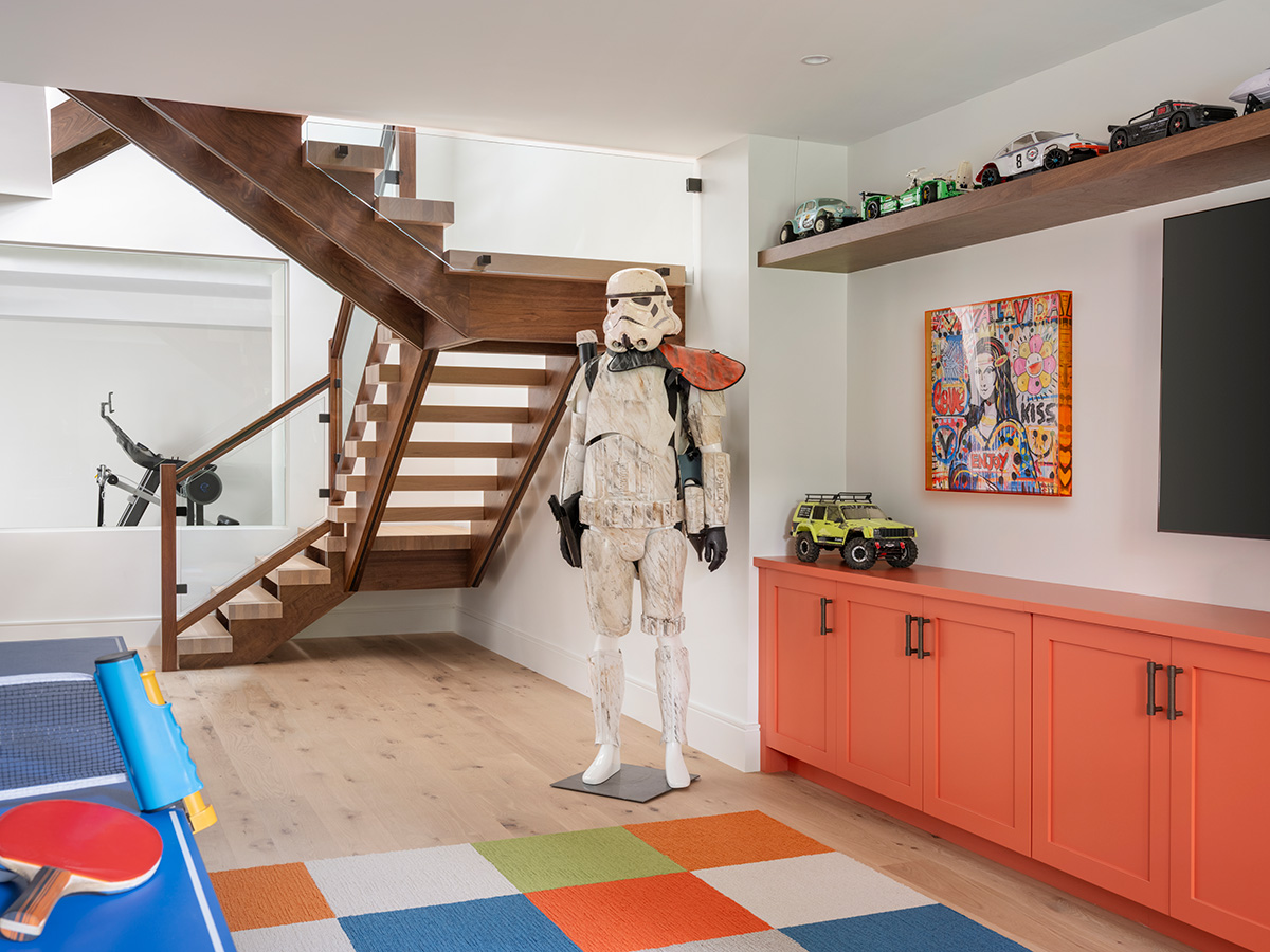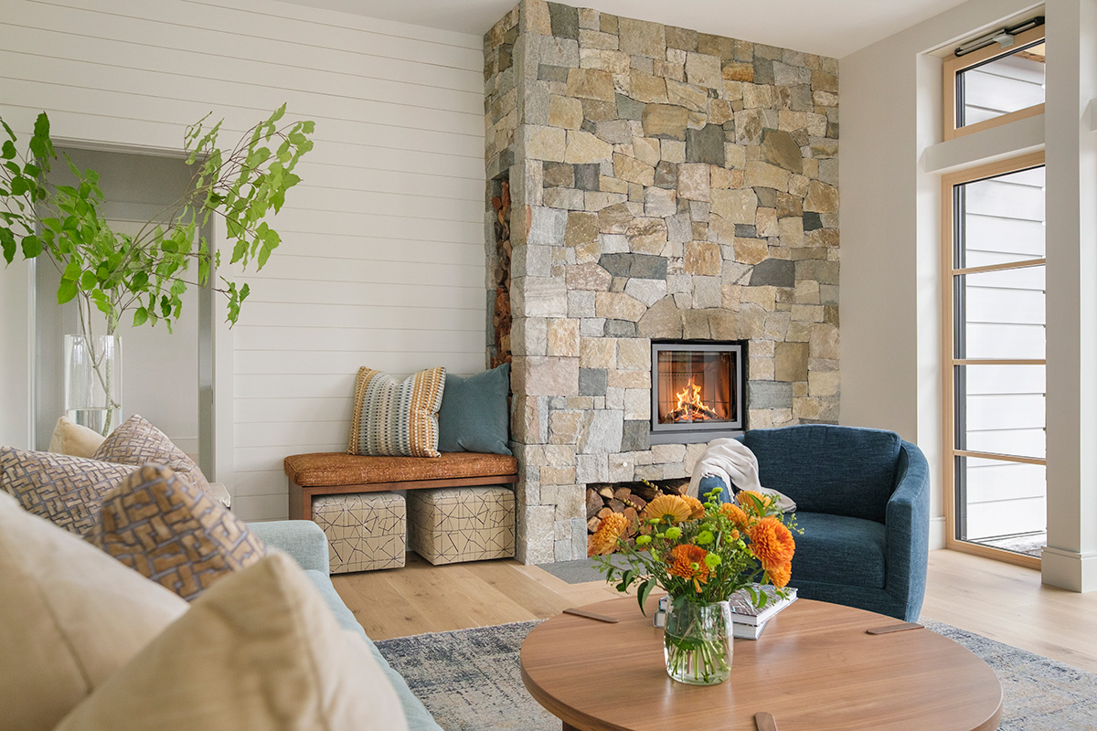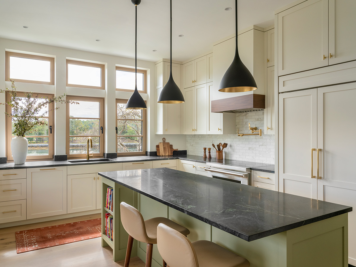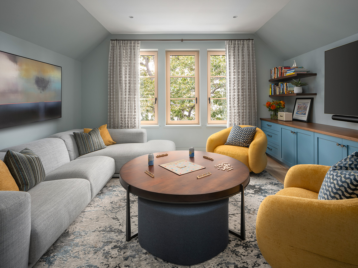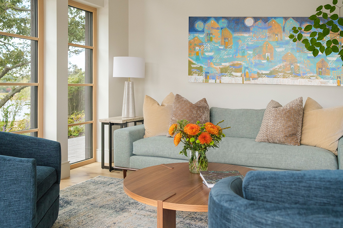 This coastal home blends modern efficiency with warmth and livability, designed to support an active family while offering a peaceful retreat. The homeowners opted for defined rooms, enhancing both energy efficiency and the quality of daily interactions. Expansive windows frame water views, while thoughtfully placed nooks create moments of intimacy throughout the home. A layered material palette — combining transitional finishes with nostalgic hues — adds depth and comfort without sacrificing a clean, modern sensibility. Color is used strategically, introducing vibrancy and personality while maintaining cohesion across spaces. The layout supports both shared activities and individual routines, balancing openness with privacy. Ultimately, the design achieves a careful equilibrium: a home that feels intentional yet relaxed, modern yet welcoming, and deeply connected to its coastal surroundings.