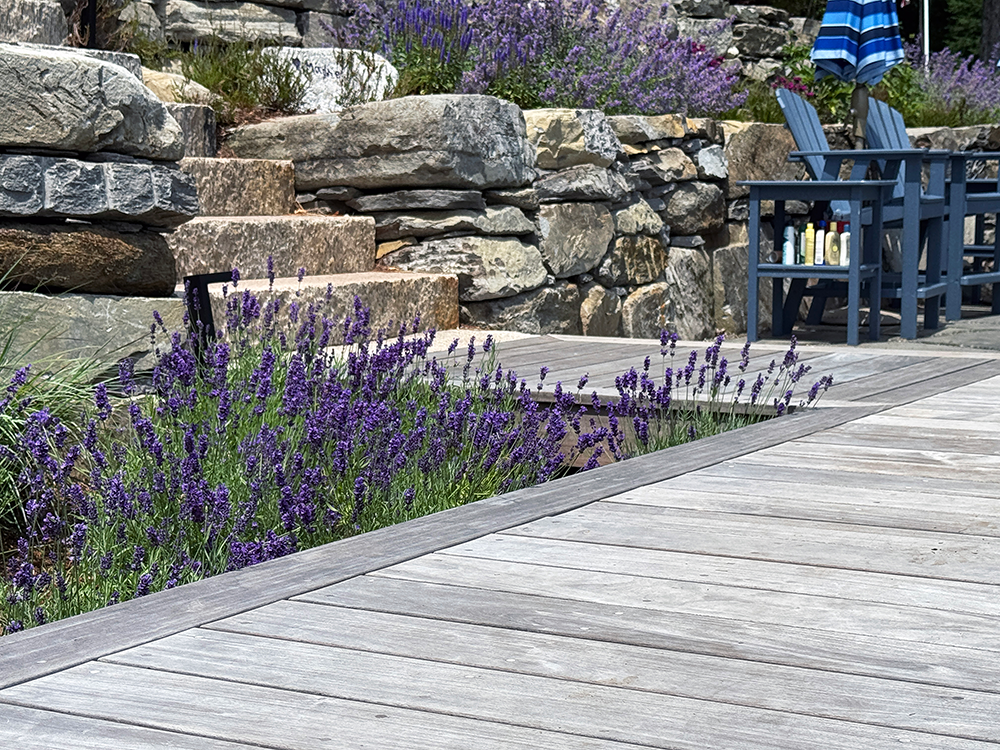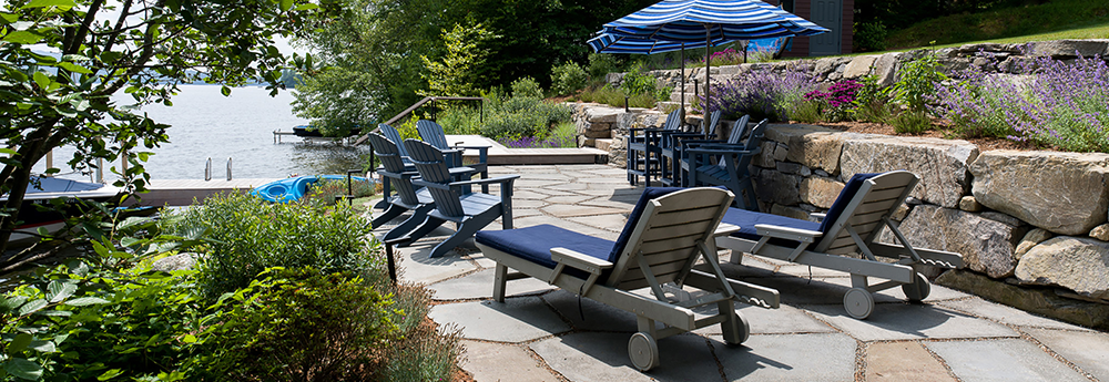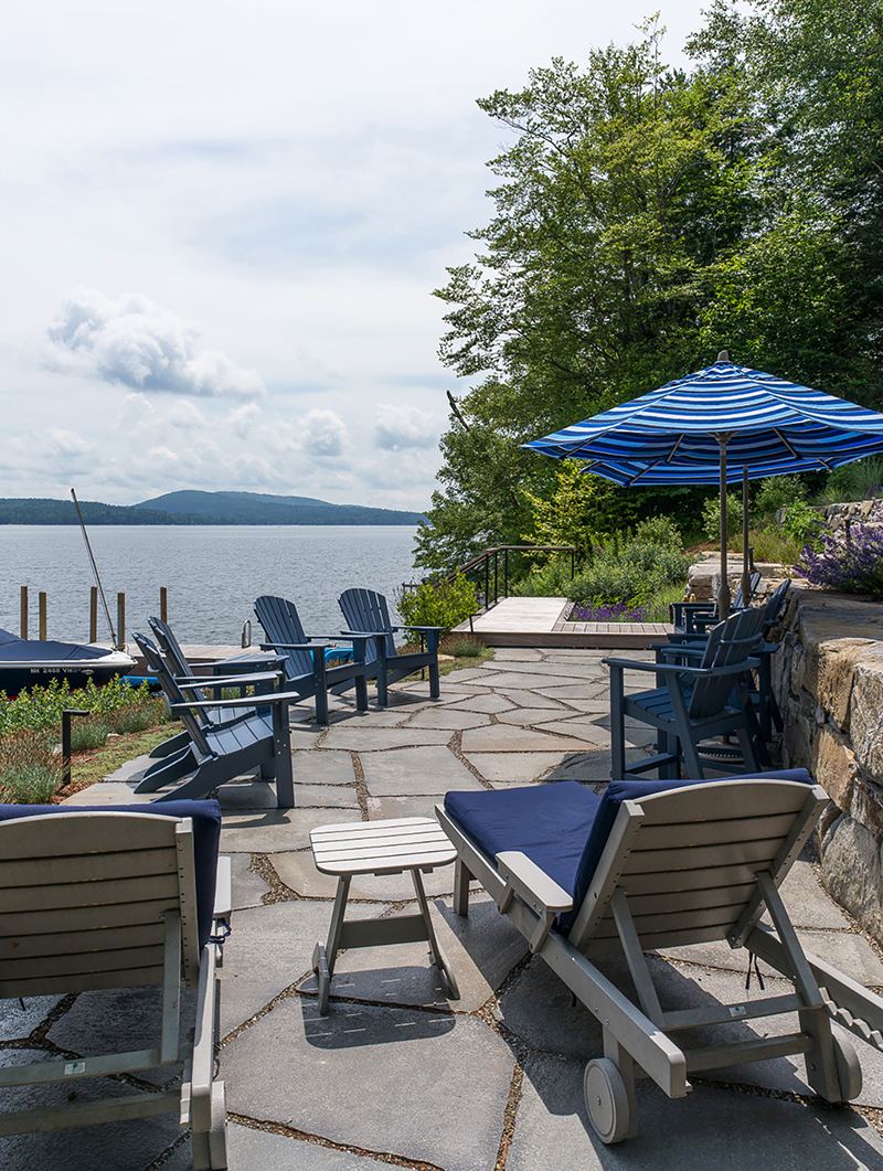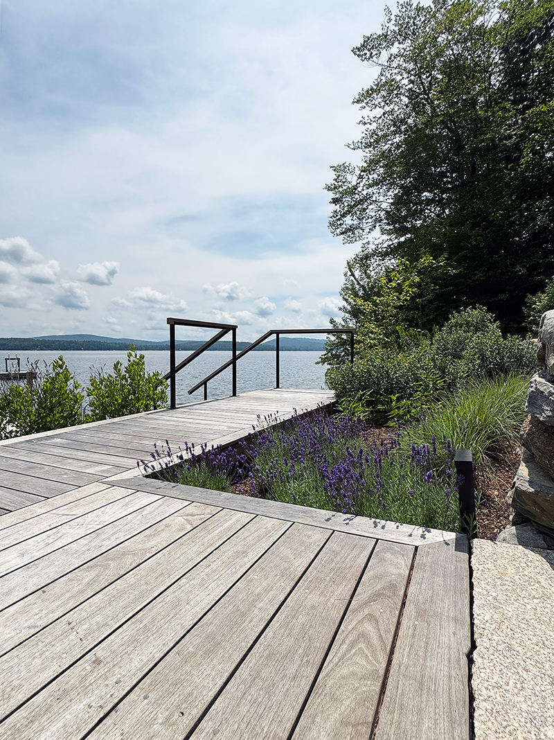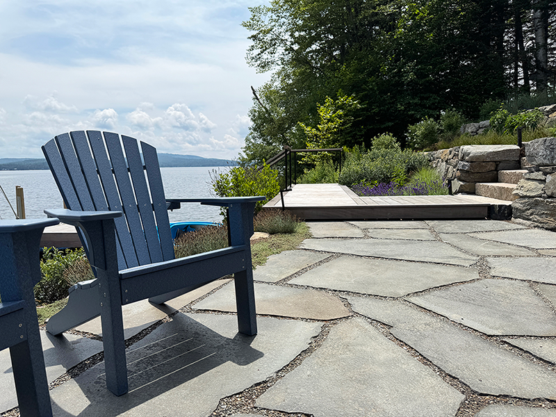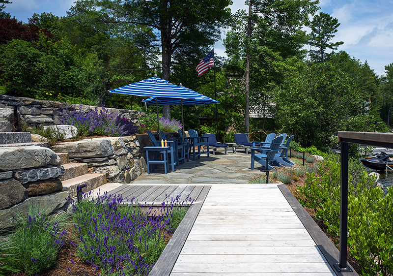 This shoreline renovation replaces deteriorating waterfront structures with a resilient, naturalistic landscape that integrates seamlessly with its surroundings. Working within strict regulatory constraints, the design maintains essential functions — seating, water access, and recreation — while improving environmental performance. Locally sourced stone forms terraces and steps, while pervious surfaces allow water to infiltrate naturally, reducing runoff into the lake. Reclaimed materials add character and sustainability. Native plantings stabilize the shoreline and provide seasonal interest, enhancing both ecological value and visual appeal. The project also included removing outdated foundations, improving lake health. The result is a thoughtful, durable landscape that enhances the waterfront experience while respecting its natural context.