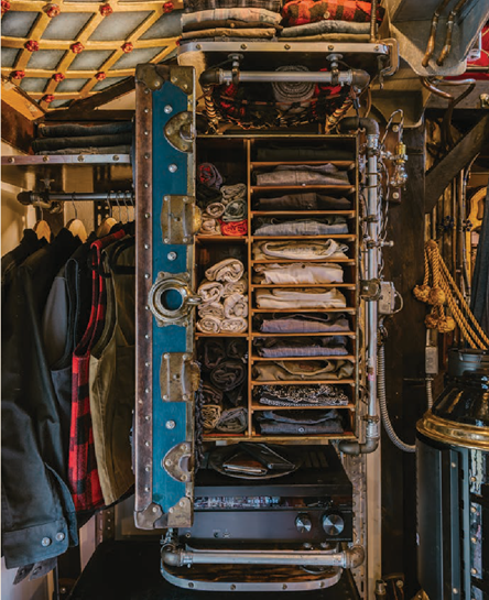 Later, after the house projects were completed, they began creating the fantastical images that open each chapter. “That was a fun process,” recalls Barcelou. “We would get dressed up and assemble images of different parts of the fantasies we had in our minds, and then send the components to our photography editor, Joel Robison, who compiled the images together for us.” As an example, the image introducing the first chapter of the book features Barcelou as a mermaid perched on a rock, the tiny house floating on stormy seas.
