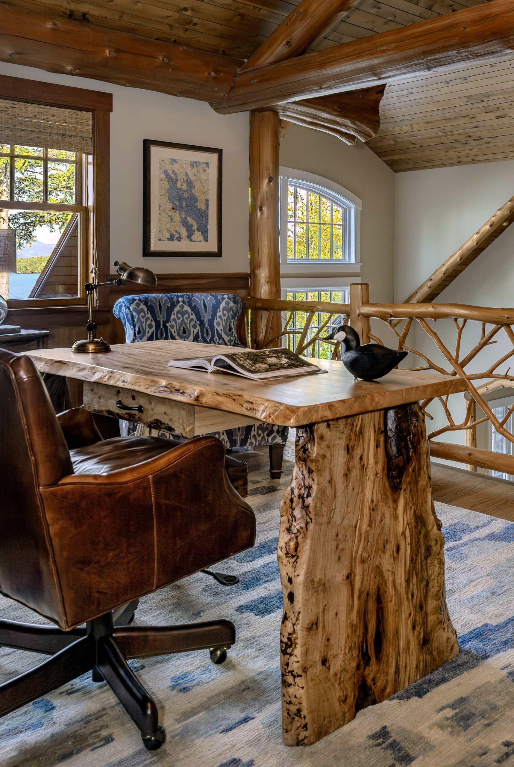 Graham says that every part of the house is designed to be welcoming and comfortable. “The den offers plenty of room to sit and enjoy a fire, read a book from the gorgeous bookcase or play a game, like backgammon, as you sit and take in the lake.” For an upstairs office, Graham called on Treemendous Designs out of Indiana to craft a one-of-a-kind working desk.