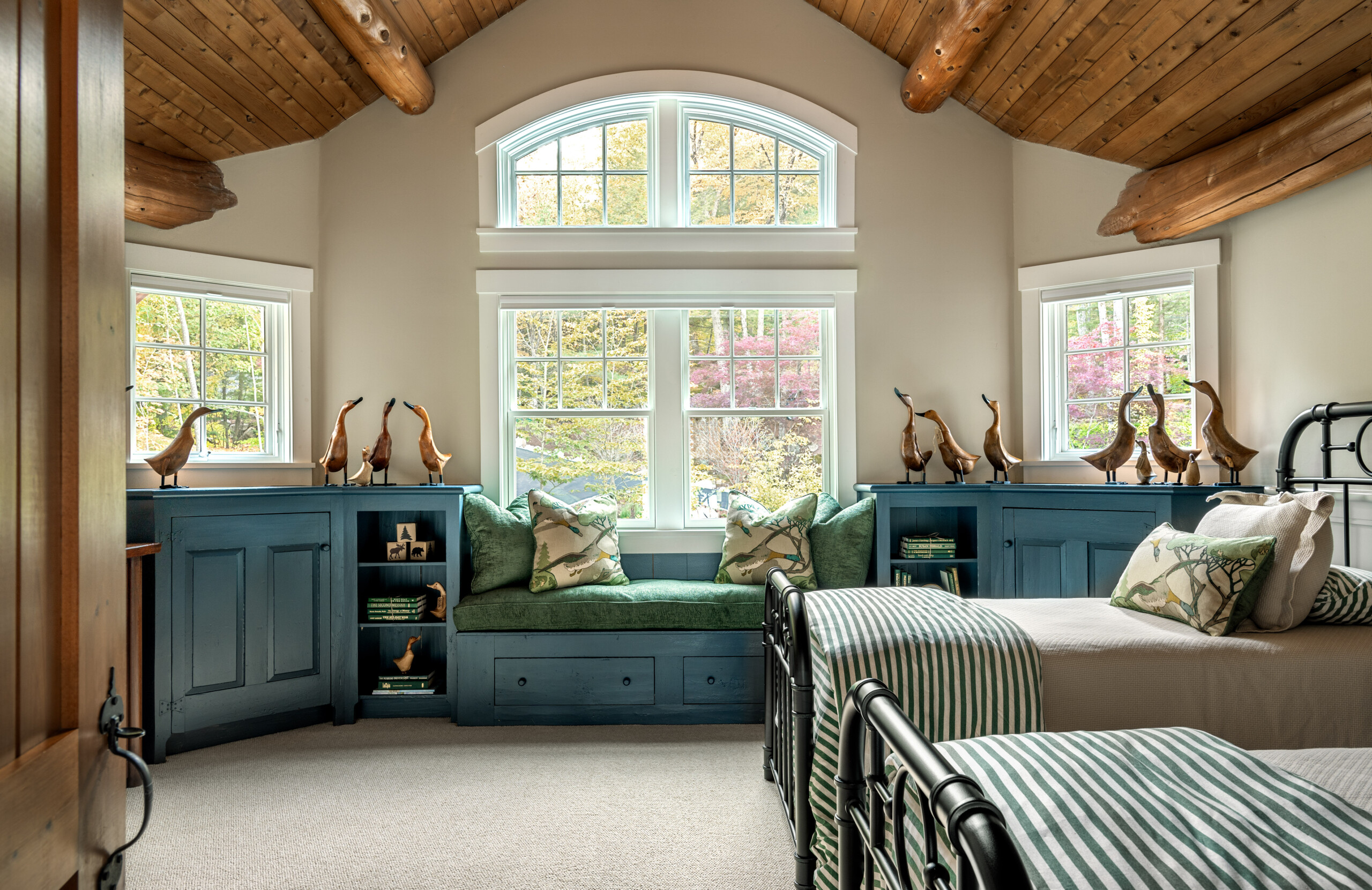 The children’s room celebrates the book Make Way for Ducklings, and the guest suite, replete with a large stone fireplace and thematic artwork, was personalized for the house guest who loves to fish. Graham notes that the “moose bedroom” is open to the living space, and down the hall is the last bedroom in the house, with an animal mural and teepee with oversized stuffed bears so kids can let their imagination run wild. In a first-floor powder room, Graham hired a muralist to create an original artwork for the space. “It showcases their view across the lake and adds a bit of fun with a bear on the back of the door,” says Graham.
